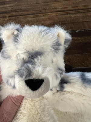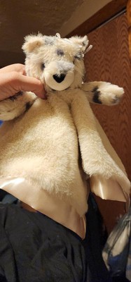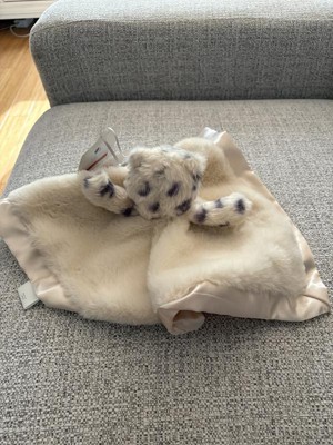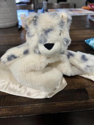 This cute little Leopard is extremely soft! The silky outside edges are something baby loves to feel and soothes them. The middle is smooth and soft. Baby loves to put his face on it. The leopard head is big enough to fit prefectlyon babys hand to have a good grasp!