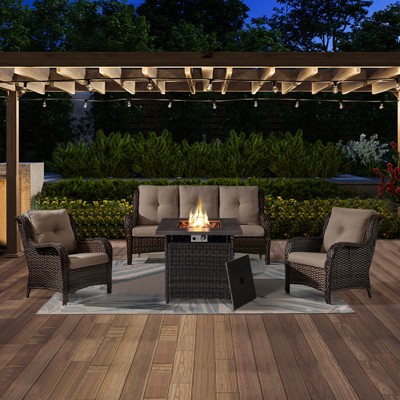 4 Pieces Patio Furniture Set with Fire Pit Table, Outdoor Sofa Set with 50000 BTU Fire Pit All Weather Wicker Patio Couch and Club Chair