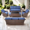 Spruce up your outdoor space with the POCASSY eight-piece rattan furniture set. This complete lounge furniture set includes two spacious patio couchs sofas, two swivel rocking glider chairs, a stylish side table, a coffee table, and two rattan ottomans, all made with durable powder-coated steel frames and weather-resistant resin rattan to withstand the sun, rain, and temperature changes. Perfect for entertaining guests or relaxing on the patio, in the backyard, or by the pool.
