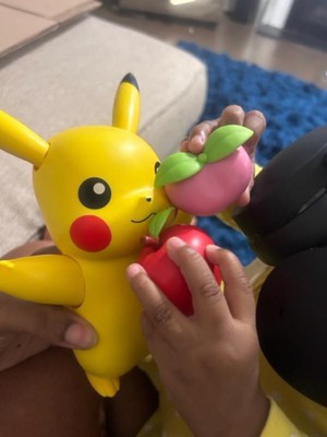 [This review was collected as part of a promotion.] My kids really enjoy playing with this Pokémon Pikachu! They like that they can feed him with the apple or strawberry and how he responds differently to each object. I think it’s cool how Pikachu responds to our voices! Pikachu is a good size and fits well in children and adult hands. The glowing cheeks is really adorable.