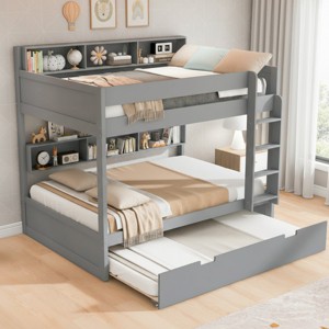 Turn one wall into a full sleep-and-storage station with this solid wood bunk bed featuring built-in shelves and a pull-out trundle. Designed for busy family homes and shared rooms, it comfortably sleeps three kids or guests while keeping books, toys, alarm clocks and headphones right where they’re needed. Open cubbies run along the back of both bunks so every sleeper has their own mini bookshelf, and the rolling trundle tucks away under the bottom bunk to save precious floor space between sleepovers.