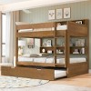 Turn one wall into a full sleep-and-storage station with this solid wood bunk bed featuring built-in shelves and a pull-out trundle. Designed for busy family homes and shared rooms, it comfortably sleeps three kids or guests while keeping books, toys, alarm clocks and headphones right where they’re needed. Open cubbies run along the back of both bunks so every sleeper has their own mini bookshelf, and the rolling trundle tucks away under the bottom bunk to save precious floor space between sleepovers.