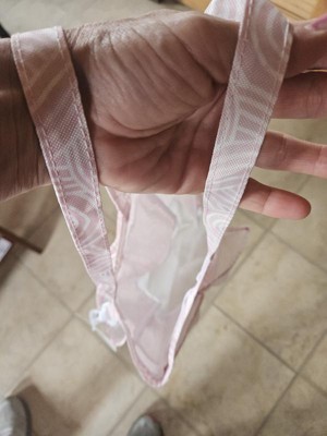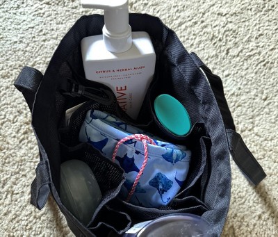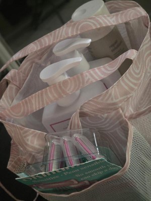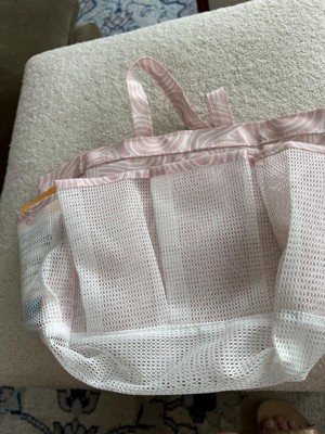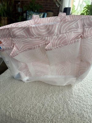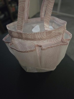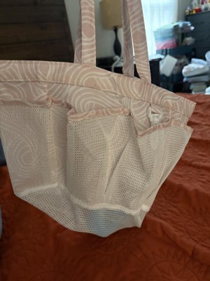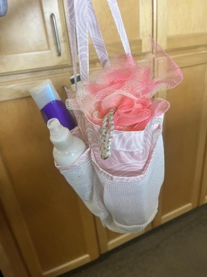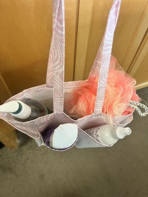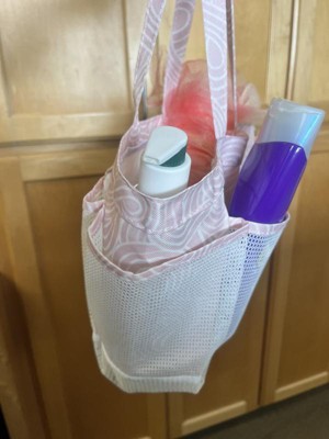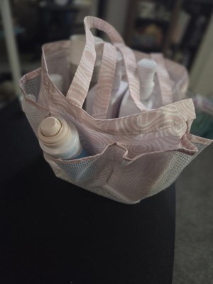 Whata great little tote bag! This little tote is meant for the shower and would be perfect for the gym or dorms. We use it for our sunscreens, bug spray, etc and keep it in the car for an easy on the go grab for outdoor activities like soccer, playgrounds, meeting friends. It keeps everything in one spot and I know right where it all is. My kids know what to look for and are able to grab it quickly and easily too. Not too big, not too small. Mesh pockets On the outside, wide open middle pocket, sturdy tote material that dries quickly, good handle size for short comfortable carries, plastic clip for an accessory. Very cute pale pink color with pattern. Def recommend!