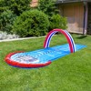 Let the competitions begin this summer, with this race track designed inflatable water slide. This slide is perfect for both kids and adults who want to cool off and have some competitive fun in the sun. With its unique race track design, you and a friend can race down the slide side-by-side, splashing and laughing all the way to the finish line. With the built-in overhead arch and sprayer, you'll stay cool and refreshed even on the hottest of days. This inflatable water slide is easy to set up and take down, making it perfect for backyard parties, family gatherings, or just a day of fun in the sun.