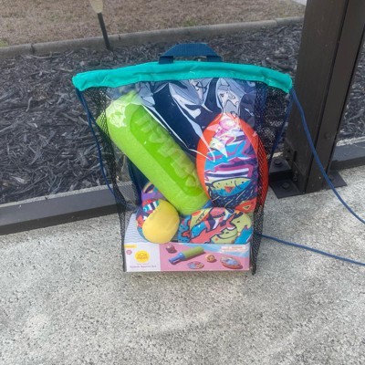 This is a great little set of pool toys. My kids love them. It's got 2 little softballs, a football, a frisbee and a foam bat. All nice and compact and I love that it comes with the vented drawstring backpack to easily store it all. The kids had a great time with these toys. We love it! This also makes a perfect gift!