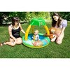 You little one will go bananas over this inflatable kid pool and toddler splash pool! The Go Bananas Monkey Kiddie Pool is the perfect sitting pool for children ages 2 and up who are getting comfortable in the water and pre-swim training. The blow up kid pool features an inflatable center seat with integrated sun canopy for shade and sun protection, all designed with adorable banana tree design. Baby will love splashing around in this portable pool, perfect for the back yard, patio or outdoor. Included with the pool is an inflatable monkey toy that squeaks when hugged. This adorable animal themed pool for toddlers holds a water capacity of 10-gallons and measures 40-inches in diameter by 32 inches high to top of tree. Please note dimensions vary based on amount of inflation used.
