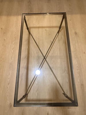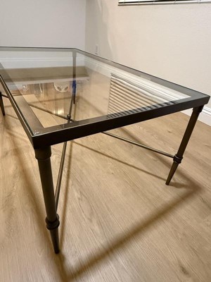 A: There are six clear plastic pads between the metal frame and the glass. The table features a bronze finish metal frame with a lower cross support, topped off with a 5mm tempered glass tabletop.