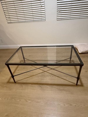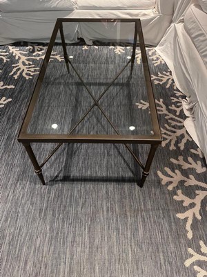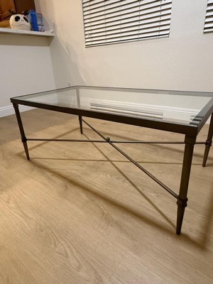 Complete your living room with the Porter Rectangle Coffee Table. This contemporary style table will add that eccentric modern look to your decor and become the center of attention of the room. The table features bronze finish metal frame with a lower cross support and finally topped off with a 5mm tempered glass tabletop. Assembly required.