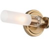 Add a splash of color and charm to your home with the mid-century modern Ingrid bathroom vanity light, from the Possini Euro Design® brand. The glamorous warm brass finish works to elevate your bathroom space with old world elegance. It is paired with a pair of glass shades, partially clear and frosted around the bulbs. Illumination is gently diffused to create a warm and welcoming glow. The Ingrid bath light is damp location rated for indoor use.