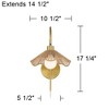 - 17 1/4" high x 10 1/2" wide. Extends 14 1/2" from the wall. Backplate is 5 1/2" diameter. Center of mounting point to of fixture is 12". Weighs 2.07 lbs.