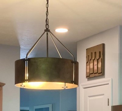 Dress up a casual entry with this stylish four-light drum pendant. A wide drum features a multi-tonal rustic bronze finish that glows in rustic or industrial decor. Clean lines make this a fabulous addition to an inviting breakfast nook or dining room.