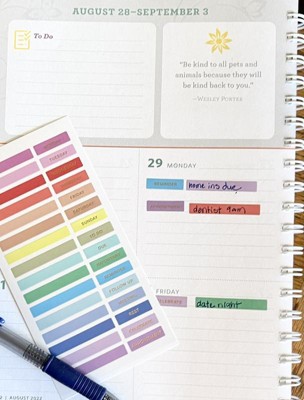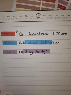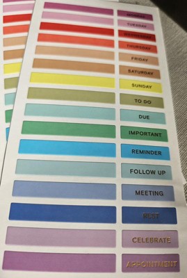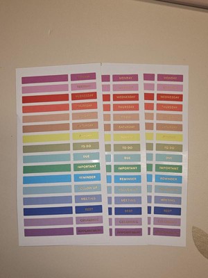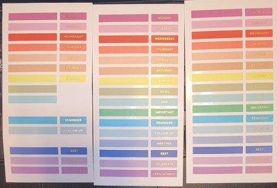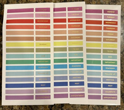 [This review was collected as part of a promotion.] These stickers have such pretty colors. They fit into the line very well. The gold lettering is pretty but a bit difficult to read if you are not in good light. They really pop on my desk calendar. I think they would work well on those page-a-day calendars that some people have on their work desks. They are not real sticky so I was able to pull them off my page and reposition them. I folded some to use as tabs on my small calendar that I keep in my purse. I smeared one that I wrote on with a gel pen, so I would suggest using a regular ink pen on them. Overall nice.