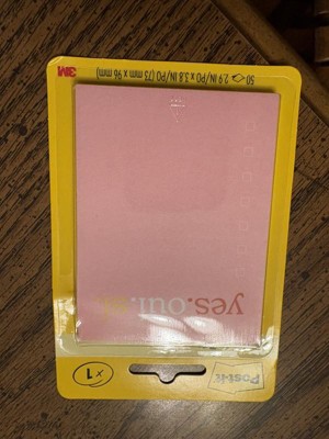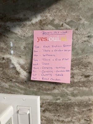 [This review was collected as part of a promotion.] I love this Post-It pad that I received to use and review. It is longer than the square Post-It pads so I can fit more on the pad. I plan to put it on my refrigerator and start the grocery list of products I need. The pink color is perfect and the words for yes in english, french and spanish are nice adornment. I have been a Post-It fan for years. Recommend.
