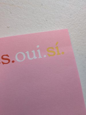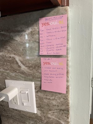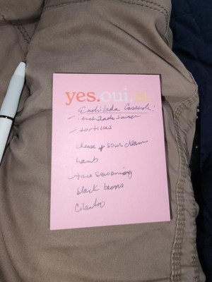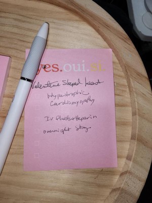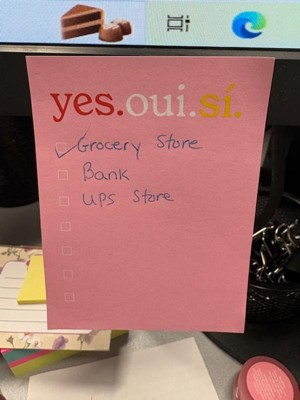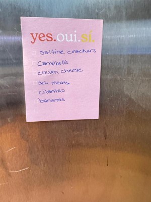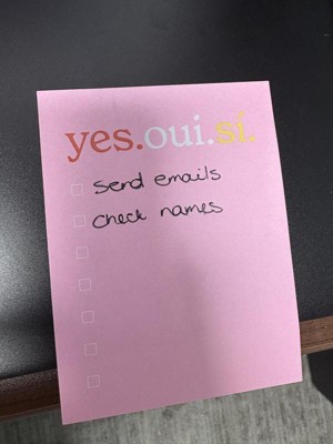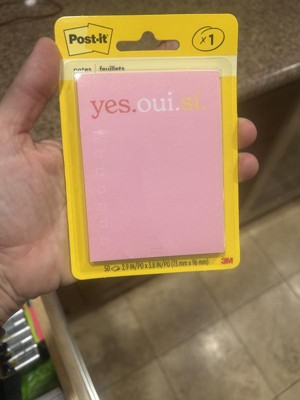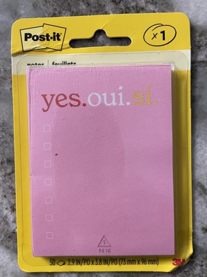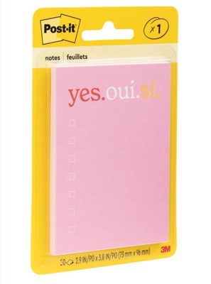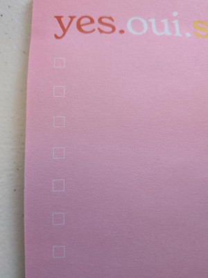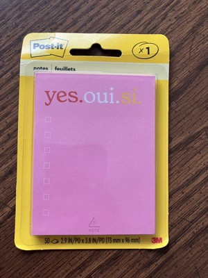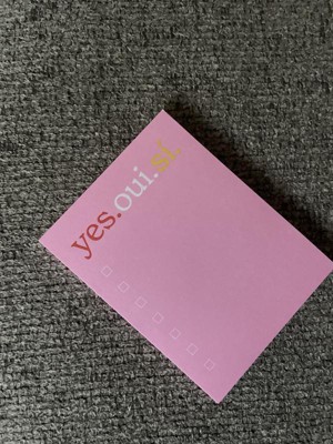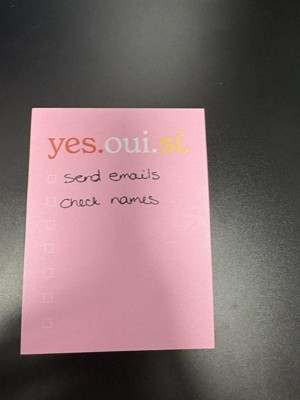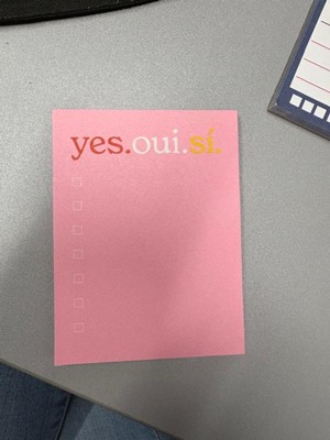 [This review was collected as part of a promotion.] I really love the ' yes.oui.si. ' post it note pad. It is the perfect size to write a short list of things to do or pick up, even has boxes to check off when you get or do the item listed. Its a perfect size to attach to my phone screen so I don't lose it, hopefully. Also the bright pink is easily seen if I do set it down & can't remember where I did.