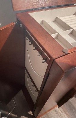 This jewelry cabinet has improved my bedroom organization so much, I shudder to remember life before it. The design is supremely effective. Minor complaints: it is super heavy, and there's a place on the top lid where I think the strip of wood "finish" might come off and reveal whatever is underneath. But overall, it's pretty delightful and I'm really happy I bought it.