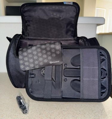 Take your Meta Quest 3 / 3S with you safely and stylishly with the PowerA Travel Bag for Meta Quest 3 / 3S. This officially licensed travel bag features a molded storage tray and elastic straps to securely hold your headset and controllers in place. The zippered closure helps protect your gear from dust and dirt, and the removable adjustable shoulder strap allows it to be worn crossbody or on the shoulder. A padded back-panel pocket holds earbuds or other small accessories. Includes a microfiber cleaning cloth and brush pen to keep your headset clean. 2-Year Limited Warranty.