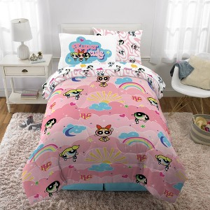 POWERPUFF GIRLS DESIGN: Dream sweetly in our Powerpuff Girls Comforter and Sheet Set! The comforter showcases the adorable trio amid fluffy pink clouds, radiating sunshine and rainbows. Paired with sheets featuring cute Powerpuff Girls illustrations, it's a delightful invitation to cozy and cute bedtime adventures!