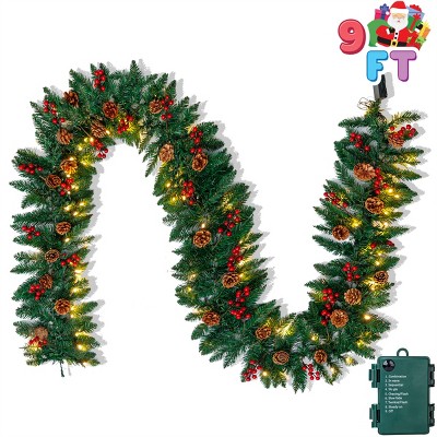 Pre-Lit Christmas Garland, Artificial Pine Garland with Pine Cones & Red Berries, Battery Operated 20 LED Lights Christmas Decorations for Front Door