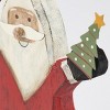 A wooden sitter from our Christmas Collection displaying Santa holding a Christmas tree recreated from original hand-carved and painted pieces with distressed details. The sitter features metal accents to create a handmade feel. Our Santa chunky sitter is designed to free-stand alone on a flat surface. A fun seasonal home accent that adds character to any display.