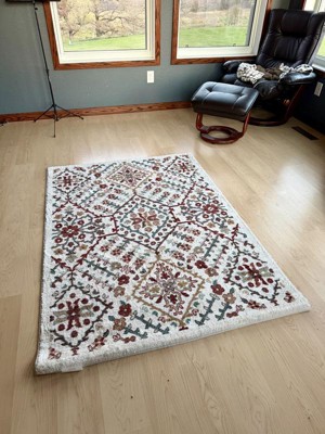 I love this rug! The pattern and colors are beautiful. Stays in place on my wood floors really well. Feels so soft to walk on, but seems durable. Easy to vacuum. Even though it arrived rolled up, it unrolled and laid flat right away.