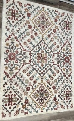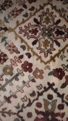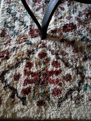 This is a gorgeous rug with a nice cream-colored background and colorful Persian design. The colors match with my decor very nicely. The dimensions are exact which is RARE with any purchased rugs these days. I needed just this size of rug for my laundry area. It's perfect. I also like that this rug is washable and has a nice non-slip backing. The pile is higher than expected and adds to the richness of the rug. Also, before I put this rug into my laundry area, my dog decided to take it over for himself. He loves soft rugs and took a long nap on it. Highly recommended.
