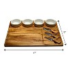 Includes 4 Cermic Bowls, 3 Stainless Cheese Tools with acacia wood handles.