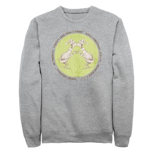 Welcome to the fantastical world of Dr. Seuss! Celebrate the most wonderful time of the year alongside the beloved childhood classic books and movies from every generation with fun new officially licensed apparel for the entire family! This Men's Dr. Seuss Christmas Means More Quote Graphic Crewneck Sweatshirt features The Grinch enclosed in a green circle, along with the iconic quote: "'Maybe Christmas,' He Thought, 'Doesn't Come From a Store.' 'Maybe Christmas... Perhaps... Means Much More!'" printed on the front. Get ready for the rhyming and whimsy of Seussville with this classic apparel today!