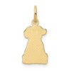 A lovable golden bow-wow with plenty of pup personality featuring a sweet expression, spotted eye and bow tie designed from 14k yellow gold. This flat pendant is approximately 8mm (5/16 Inch) in width by 15mm (9/16 inch) in length and finished with a traditional jump ring. Chain not included. Additional features include: solid 14k yellow gold flat design; polished and textured finish with textured back; approximate charm size 8 x 15mm; average weight is 0.68 grams.