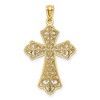 Celebrate and honor all special occasions with jewelry of religious significance! Our collection of spiritually inspired designs that show faith, hope and devotion are perfect for commemorating life's milestones. This fleur de lis cross pendant crafted in 14k yellow gold with white rhodium plating features a diamond-cut and textured filigree design. The approximate size is 18mm (11/16 inch) in width by 32mm (1 1/4 inch) in length with the bail. This item does not include a chain. Additional features include: crafted in 14k yellow gold & white rhodium; features a diamond-cut & textured filigree design; approximate size is 18mm in width x 32mm in length; average weight is 1.14 grams.