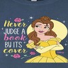 Disney Beauty & The Beast - Belle - Never Judge A Book By Its' Cover - Juniors Fitted Graphic T-Shirt - Add a touch of magic to your wardrobe with this graphic apparel featuring iconic Disney designs. Showcasing beloved characters and classic imagery, each piece combines nostalgic charm with modern style—perfect for Disney fans of all ages. Whether you're headed to the parks or just adding whimsy to your everyday look, these graphics bring the magic to life.