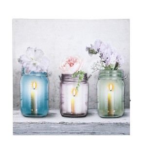 Add some rustic and farmhouse charm to your home with this beautiful canvas wall art print. The canvas print will add a splash of color to your everyday decor. The farmhouse style print features three candles and colorful flowers in a mason-style jar. There is a light set behind the canvas at each candle flame. Just turn the switch on the side of the print to "on" to see the candles glow. Display this farmhouse-style artwork in your dining room, living room, bedroom, kitchen, or office to complement your own decor style. The homey print is also a great gift for your family and friends. Batteries are required (not included).