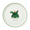 Product Specification: 10.7 inch cake stand featuring a green border wraps around the edge of the plate and foot, enclosing a whimsical hand-painted illustration of a woman hedge cutting This display stand is Dishwasher Safe.