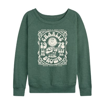 Women's Peanuts Snoopy Halloween Dog House Lightweight French Terry Wide Neck Long Sleeve Graphic Shirt - Heather Juniper - Medium