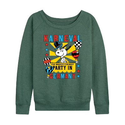 Women's Peanuts Snoopy On Flag Heart Lightweight French Terry Wide Neck Long Sleeve Graphic Shirt - Heather Juniper - Medium