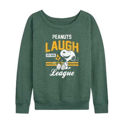 Women's Peanuts Snoopy Groovy Heart Lightweight French Terry Wide Neck Long Sleeve Graphic Shirt - Heather Juniper - Medium