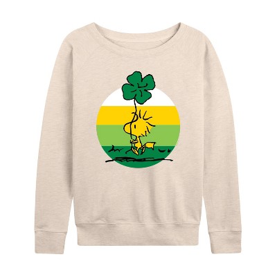 Women's Peanuts Woodstock With Flower And Pattern Lightweight French Terry Wide Neck Long Sleeve Graphic Shirt - Birch - Small