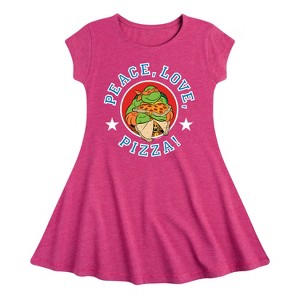 Teenage Mutant Ninja Turtles - Peace Love Pizza - Toddler & Youth Girls Fit & Flare Dress - Unleash your inner hero with Teenage Mutant Ninja Turtles graphic apparel, featuring bold and colorful designs of the iconic heroes in a half shell—Leonardo, Donatello, Raphael, and Michelangelo. Perfect for fans of all ages, this collection celebrates the action-packed adventures, brotherhood, and fun-loving spirit of these legendary sewer-dwelling ninjas.