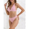 Feature: 2 pieces, solid color, ribbed fabric, drawstring halter bikini triangle top, crisscross straps at the back, removable padded cups, no steel ring, high cut triangle bottom, stretchy fabric