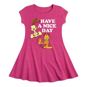 Garfield - Have A Nice Day - Toddler And Youth Girls Fit And Flare Dress - Bring the humor and laziness of the famous orange cat to your wardrobe with Garfield graphic apparel. Featuring Garfield, Odie, and Jon, these designs celebrate the iconic comic strip and its beloved characters.