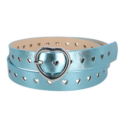 Add a decorative touch to your outfit with this metallic belt. The heart shaped buckle adds a unique flare that is sure to spruce up your wardrobe. With many ways to wear this belt is one size fits most up to 39 inches. Made of Synthetic