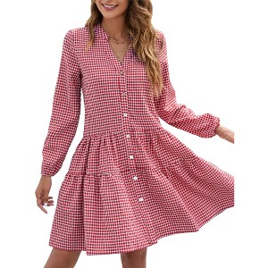 Women's Casual Plaid Dress Long Sleeve V Neck Button Down Short Dress Ruffle Swing Pleated Mini Dress - 1 of 4