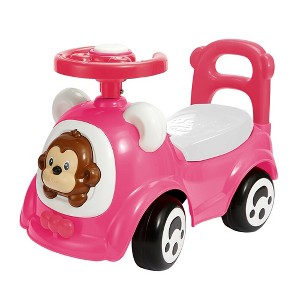 STYLISH DESIGN. Boasting a sleek, vibrant design, this car is sure to captivate your child with its bright pink color. The adorable monkey graphic on the front adds extra charm. Roll and play in style.