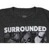 Great Deadpool Crackle Design – This Marvel Deadpool t-shirt showcases a distinctive front design featuring a mix of black and white graphics with one standout color illustration of Deadpool. The “Surrounded by Greatness” slogan adds a bold statement with a crackle effect, giving the tee a vintage-inspired, worn-in look that Deadpool fans will love