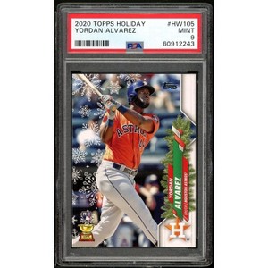 The Yordan Alvarez Rookie Card 2020 Topps Holiday #HW105, graded PSA 9, features the standout Houston Astros player in a festive-themed card design from the popular Topps Holiday series. This card captures Alvarez's impressive rookie season and is a coveted piece for collectors seeking to add a promising young talent to their collections.
