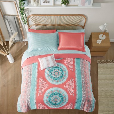 7 Pcs Stylish Boho Print Comforter Set, All Season Home Textile for Modern Bedroom Decor, Coral, Twin