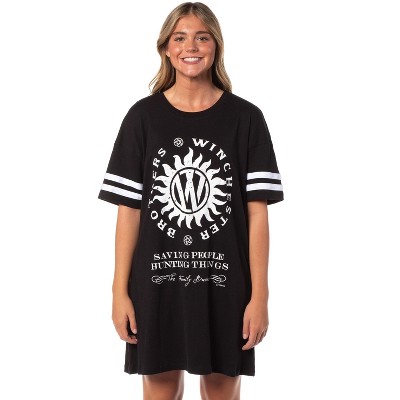 Classic Television Design: This Supernatural pajama sleep dress features the lines from the series "Winchester Brothers" and "Saving People Hunting Things The Family Business." The words surround a distressed anti-possession symbol. Join Dean and Sam in their fight against the world of the supernatural with this pajama dress, fit for everyday wear!