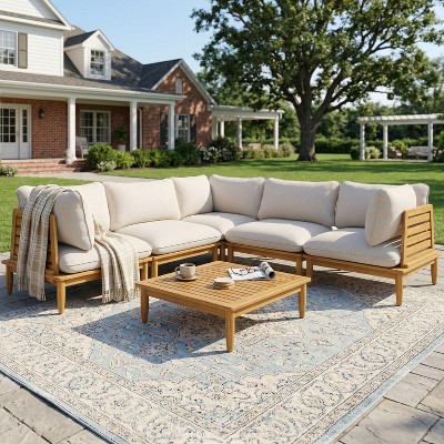 Christopher Knight Home Keith Outdoor Acacia Wood 8 Seater Sectional Sofa Chat Set with Cushions, Teak/Blue