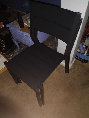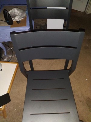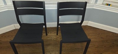 [This review was collected as part of a promotion.] Nice chairs. They feel pretty sturdy and have a clean look to them. Will go nicely with any patio set. Easy to assemble. Love the space saving feature of them being stackable when not using them.