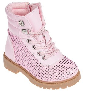 bebe Toddler Girl's Short Lace-up Ankle Combat Boots with Quilted Collar and Heatseal Rhinestones, Pink, 6