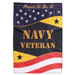 This garden flag by Magnolia Garden is designed with a combination of fabric appliques and exquisitely detailed embroidery on both the front and back;; Flagpole not included. Features artwork that reads, "Proud To Be An NAVY Veteran" in trendy embroidered style font; A large swooping center stripe features yellow corners with stars and a dark blue center bordered on the top by a blue field with white stars and a bottom border of red and white stripes. Made of quality polyester double thickness material; These flags are heavier than most others on the market and will hold up for longer, They will retain its color and beauty for years if displayed in shade or semi-shade, and is rainproof; Measures approximately 13 inches wide and 18 inches tall. Perfect for displaying in a garden, on its own or as part of a garden display year-round; Fits most standard garden poles, sold separately; Care Instructions: Handwash in cold water, Air dry with no heat. Contained in protective packaging; Ready for easy gifting for a housewarming, birthday, or any special occasion